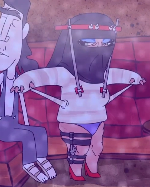 Cherries Jubilee is a dancer that works at The Jiggle Hut which Early Cuyler told Ellis to look at when he asks about his dancers could stand to be a little more flexible since he thought that she moved like a scarecrow when the Jubilee tries to dance for Randy but accidently hits him instead. Ellis then mentioned a "Ugh!" because he begged her to take a break after the tractor rolled on to her but she got them bills, which suggests that she got rolled over by a tractor, which explains her current appearance. Like a dancer, that resembles and the Blondie Stripper, she is wearing a Virgin mask on her face. She also has eyelashes with blue colored eyelids and wears purple panties and red high heels.