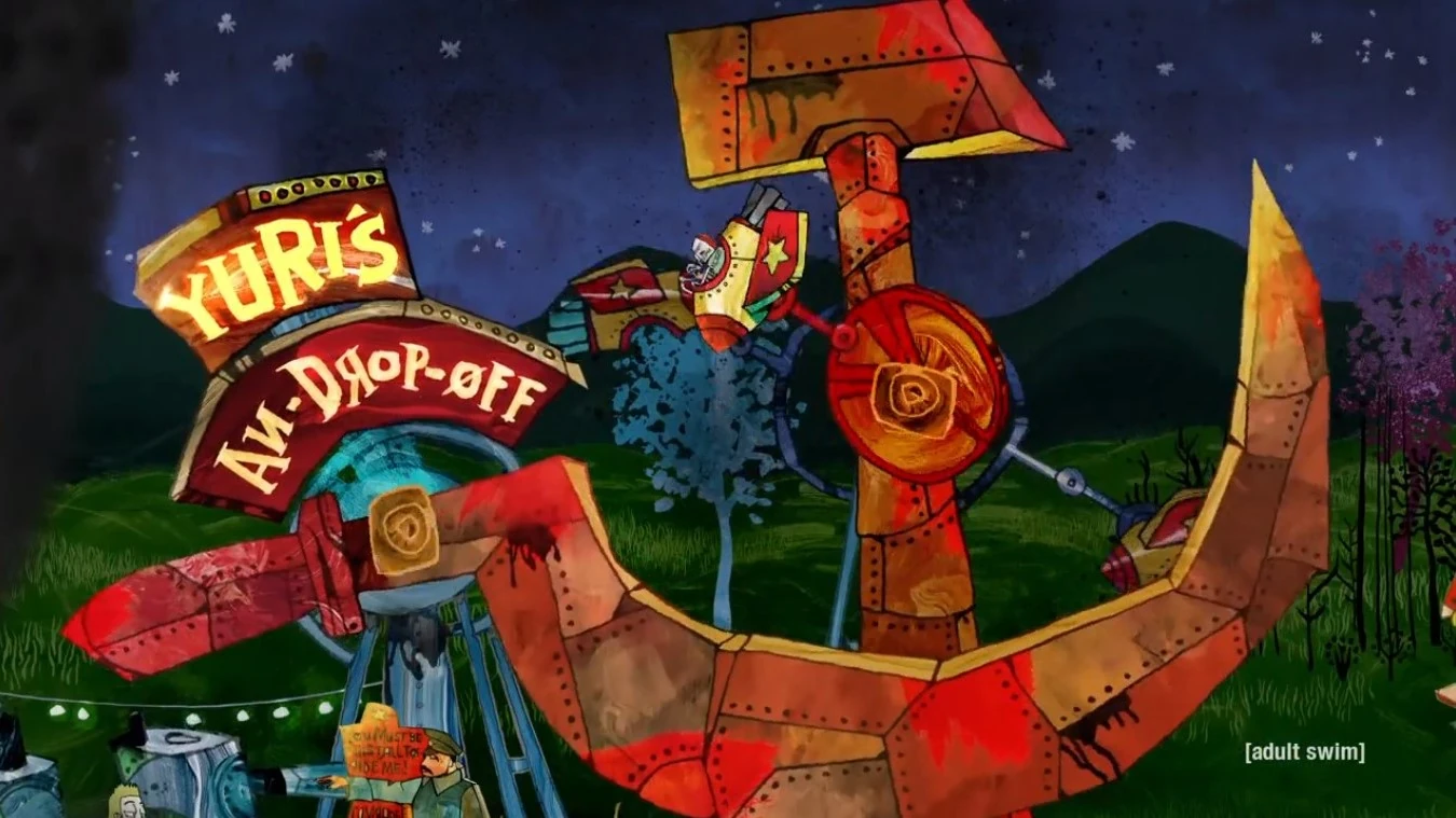 - This episode contains a fair of amusement park rides like the "Yuri's An-Drop-Off". There is also yellow teddy bears being sold for free and their called "Banana Splits".