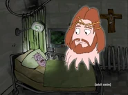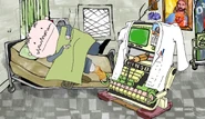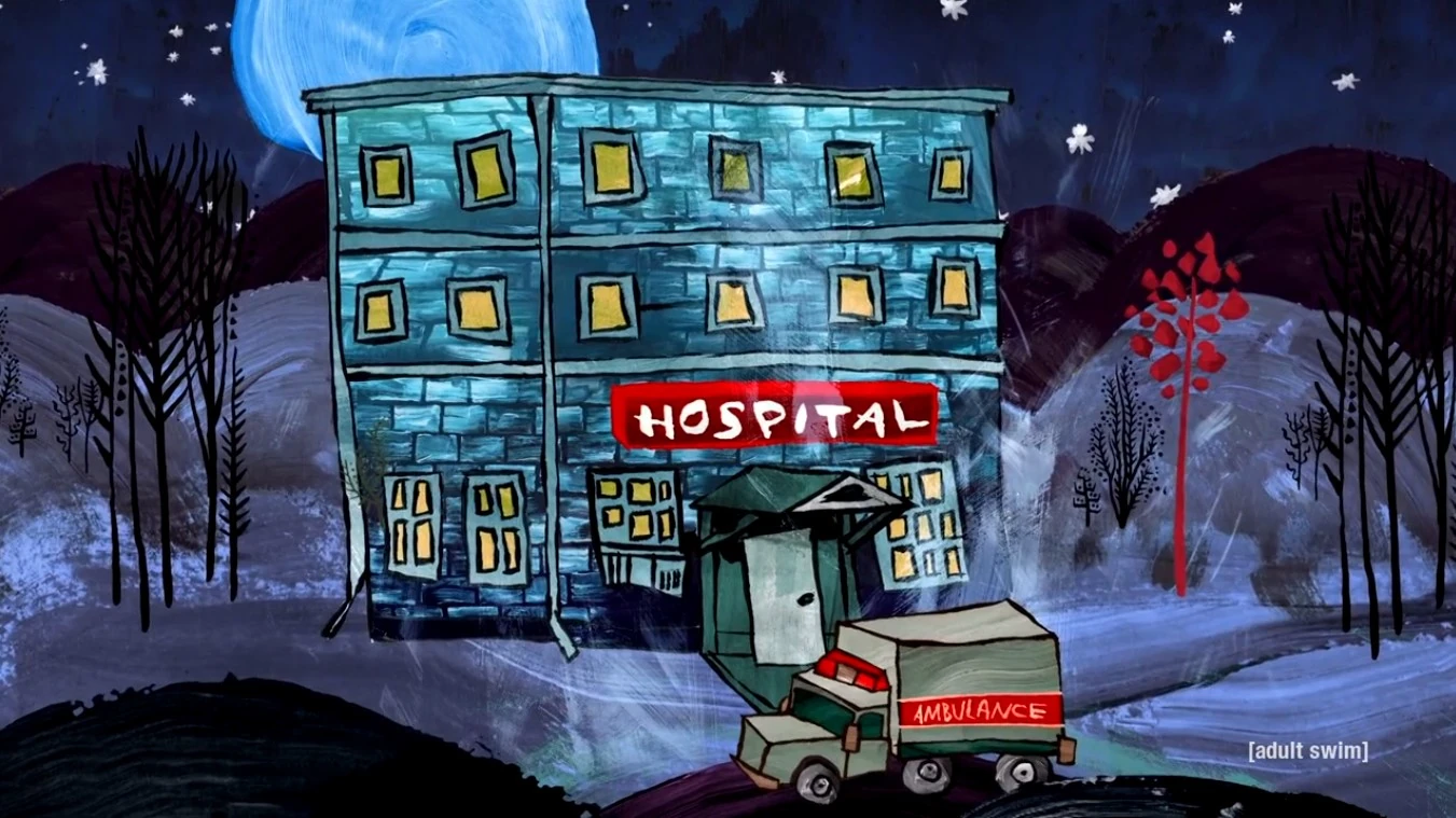 Hospital is a minor location in Squidbillies. The building was originally a nursing home (see Trivia below), which is a real hospital seen in some episodes. It is similar to the Clinic located somewhere in Dougal County, similar to that of the clinic, the hospital is used to heal injured people, and are taken to a ambulance. Some doctors, and nurses work here such as Dr. Cock, a Super Computer and Dr. Bug. Granny is often seen at this hospital, due to her injuries. Some of the characters that get injured, and sent here to get recovered such as Early (a few times, such as a bear attack), Rusty (a gunshot from Early), and Sheriff (who obviously had his foot be reattached to his leg). Tammi also gave birth to her son Randy here. The Hospital also appears to be Christian, as Jesus themed imagery appears in the hospital such as a picture of Jesus Christ on the wall, and a prop depiction of Jesus Christ on the cross.